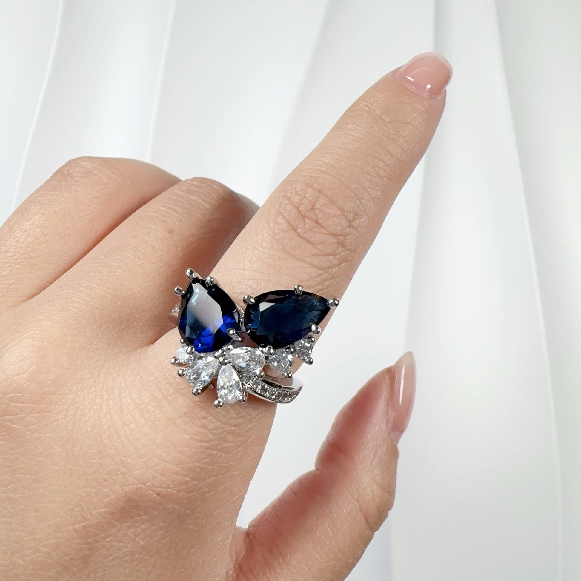 This elegant ring features a 2-carat blue sapphire-colored cubic zirconia, radiating deep brilliance. The refined setting enhances its glow, while the adjustable open-band ensures a comfortable fit. Crafted from high-quality white gold plating and zircon spinel accents, it’s a perfect blend of luxury and durability for any occasion.