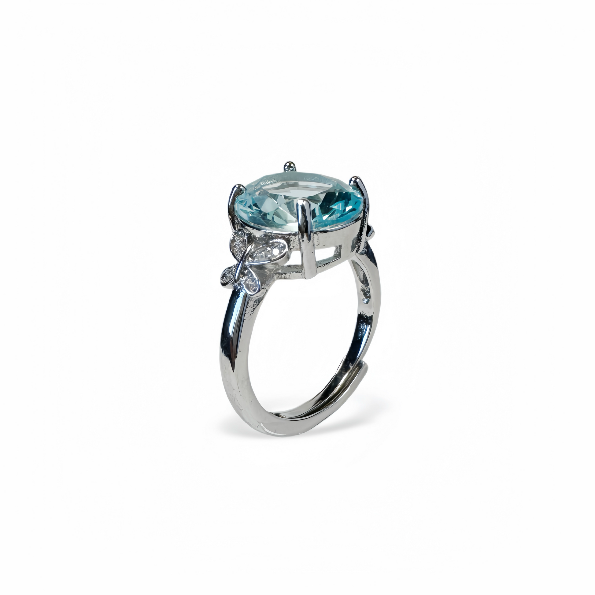 This elegant ring features a 3-carat aquamarine-colored cubic zirconia in a cabochon cut, radiating a serene glow. Crafted from high-quality white gold plating and zircon spinel accents, the adjustable open-band ensures a comfortable fit. A timeless statement of luxury and grace for any occasion.