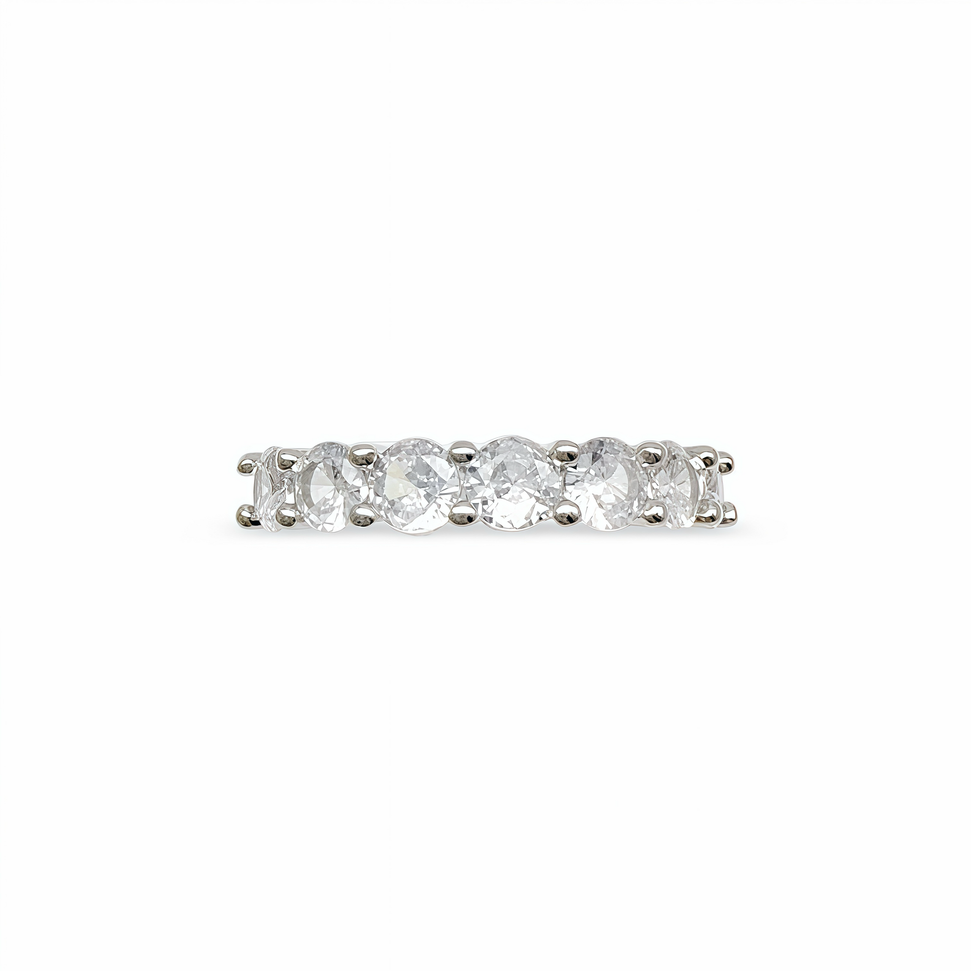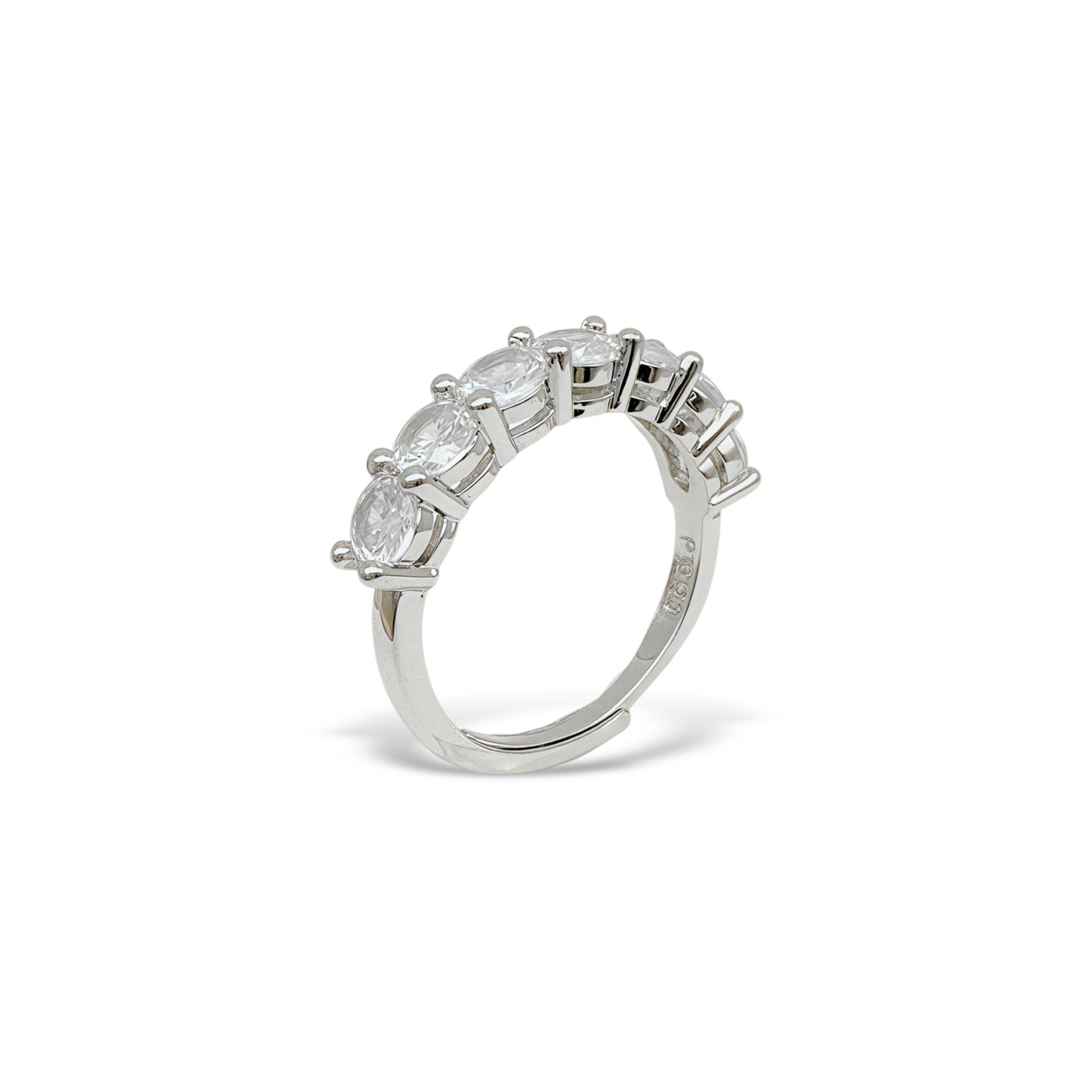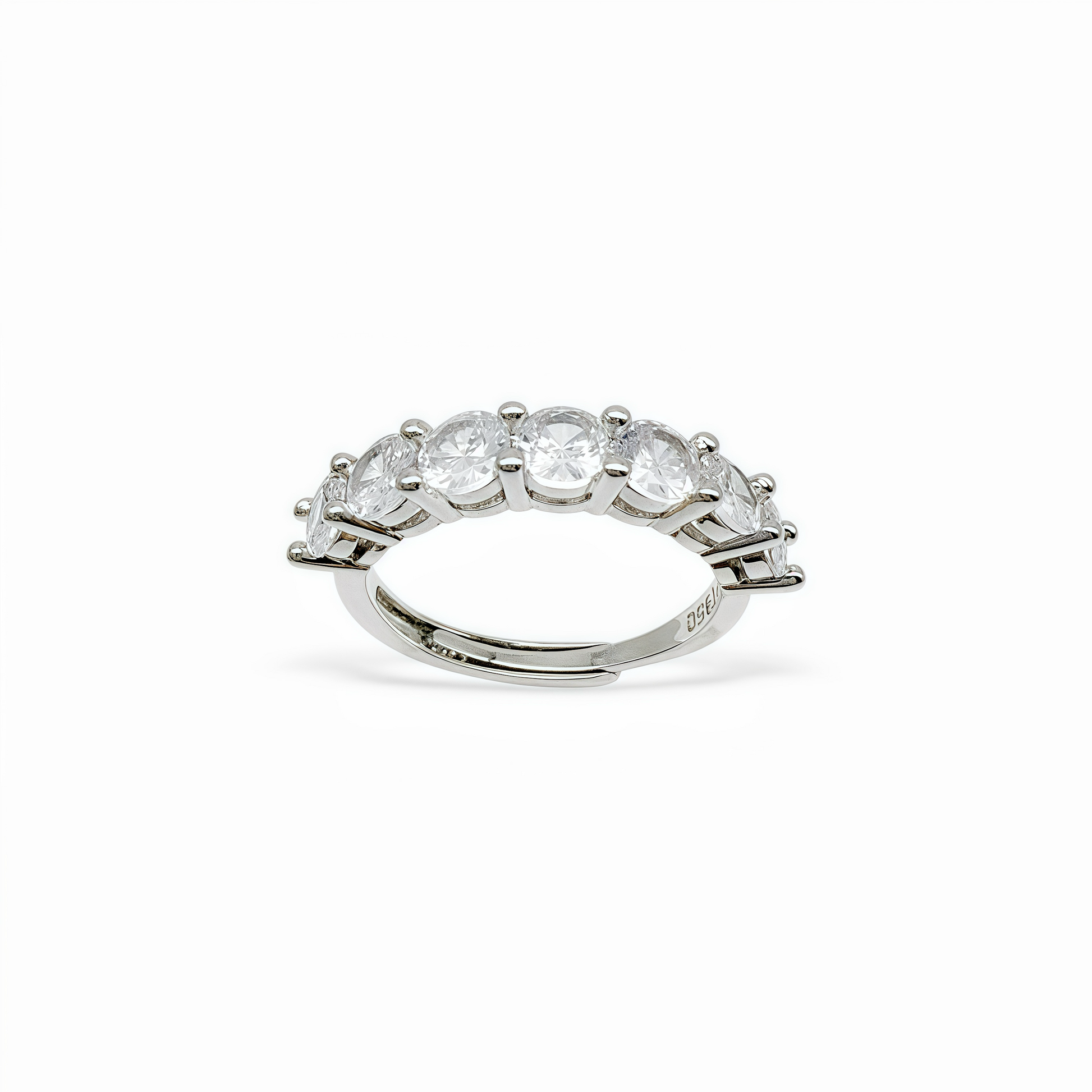 This elegant ring features seven 0.25-carat lab-created cubic zirconia stones in a sleek row design, showcasing dazzling brilliance. Crafted from high-quality white gold plating and an adjustable open-band, it offers modern luxury and timeless charm, perfect for any occasion.