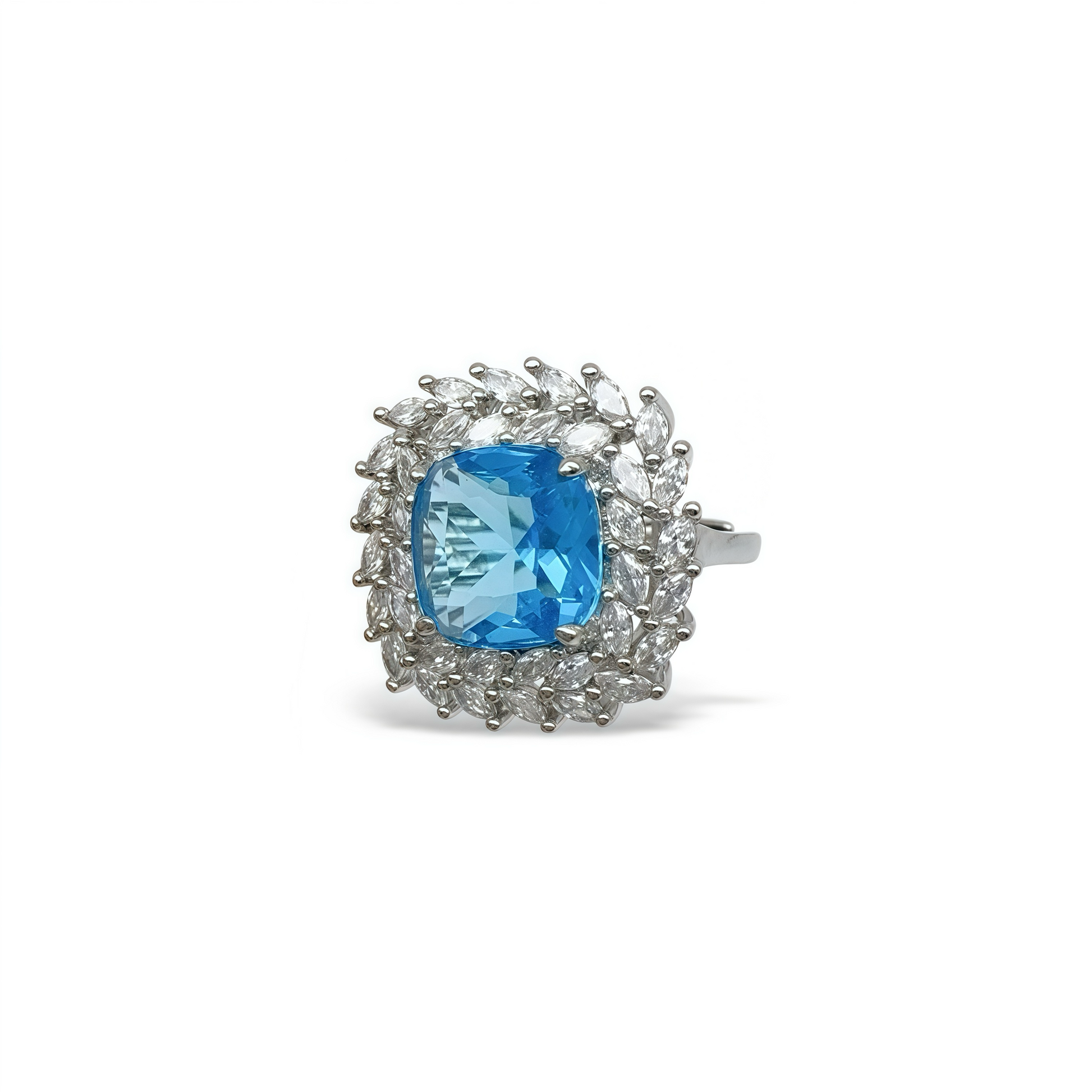 - Design: Halo setting with Asscher-cut centerpiece, radiating refinement and brilliance, open and adjustable